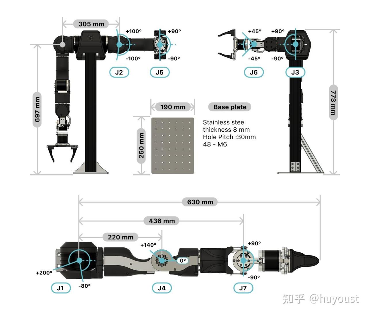 OpenArm具有类人小巧的体格,支撑柱采用铝制框架,便于调整尺寸和连接摄像头、传感器和其他附件,底板具有均匀间隔的M6螺纹孔,允许将其直接固定在桌子或其他表面上,每个关节都有机械限制,限制了安全的运动范围。