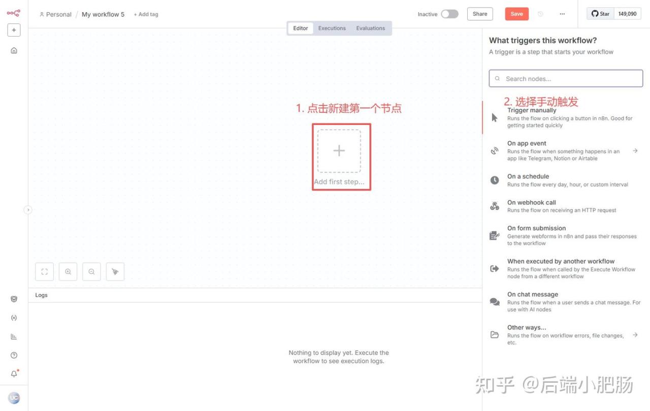 回到n8n界面,点击【Create Workflow】新建工作流,来到工作流界面编辑界面后新建第一个节点,选择手动触发节点(Trigger manually)。
