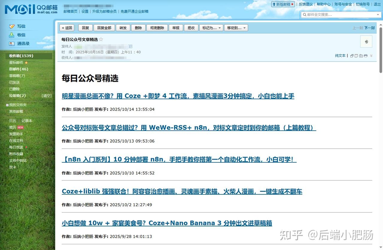 到这里,基于 n8n+WeWe-RSS 实现公众号对标文章定时推送邮箱的完整教程就结束了。大家有什么想看的教程也可以在评论区留言,我觉得可以就会做。