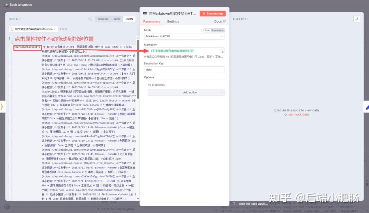 点击【+】按钮添加第6个节点Markdown,Mode选择Markdown to HTML,Markdown选择前一个节点的markdownContent属性,还是点击属性拖动到面板。