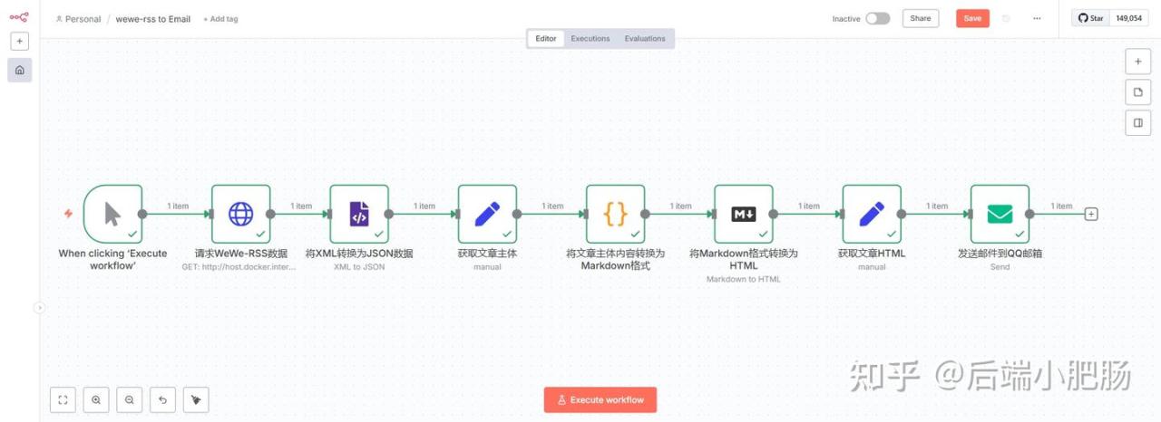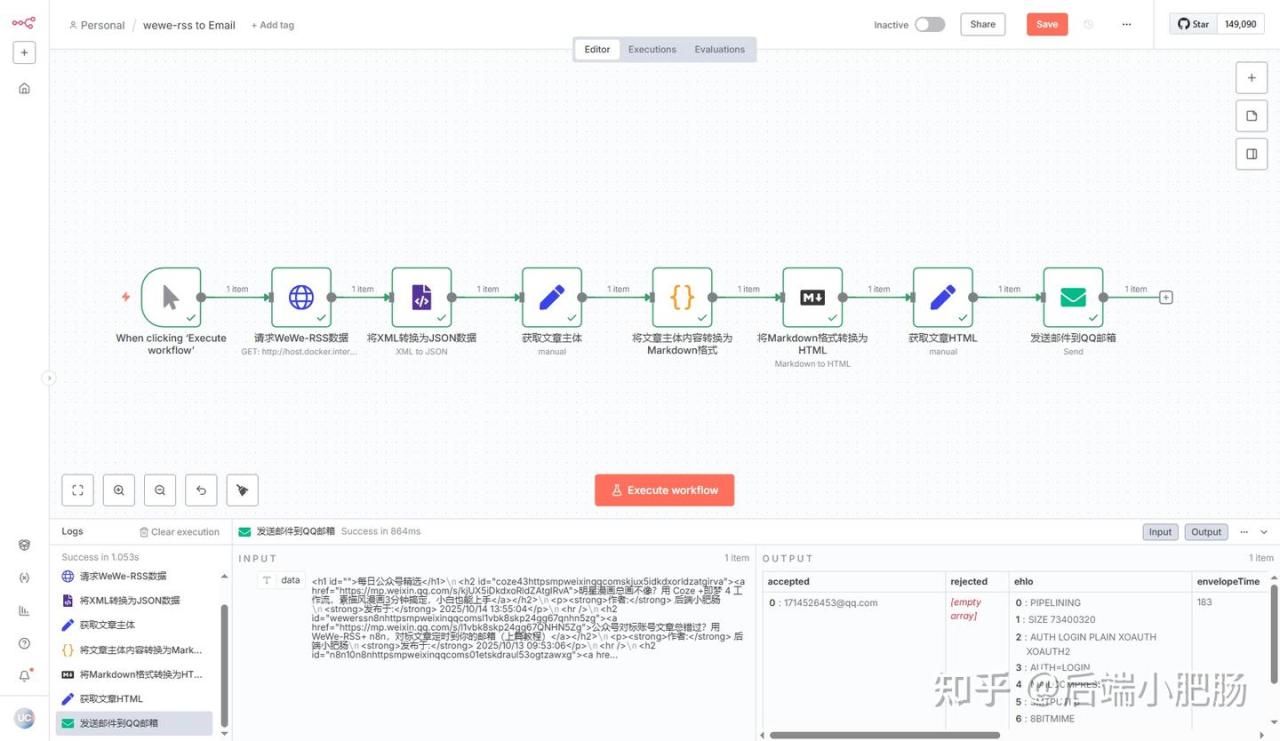 在上一篇文章公众号对标账号文章总错过?用 WeWe-RSS+ n8n,对标文章定时到你的邮箱(上篇教程),我教大家安装了wewe-rss(公众号内容聚合工具),本篇内容将用n8n结合wewe-rss实现将公众号对标文章每天定时推送到你的QQ邮箱,让你不再错过精彩内容。