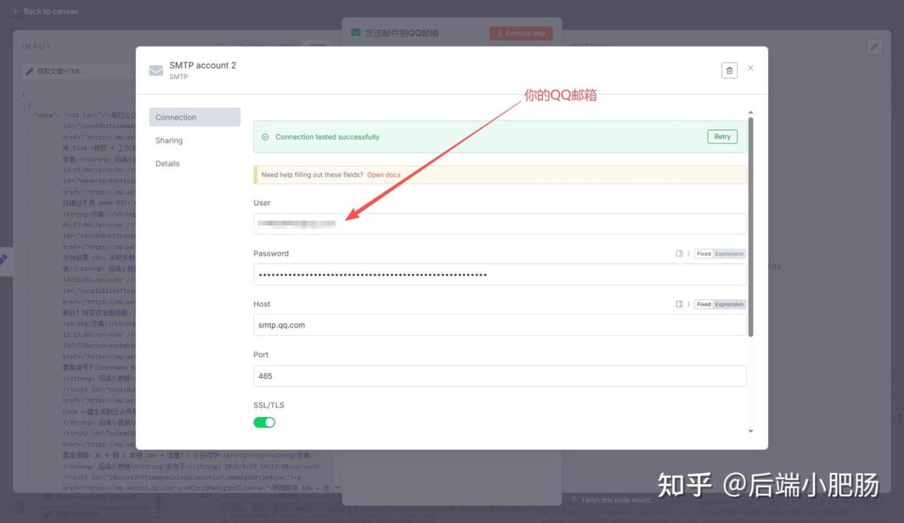 点击【+】按钮添加第8个节点Send Email,在Credential to connect with设置处点击【Create new credential】,User处填入你的QQ邮箱,Password填写2.1小节获取的授权码,host填入http://smtp.qq.com,port填入465,如顶部显示Connection tested successfully 则代表参数正确。