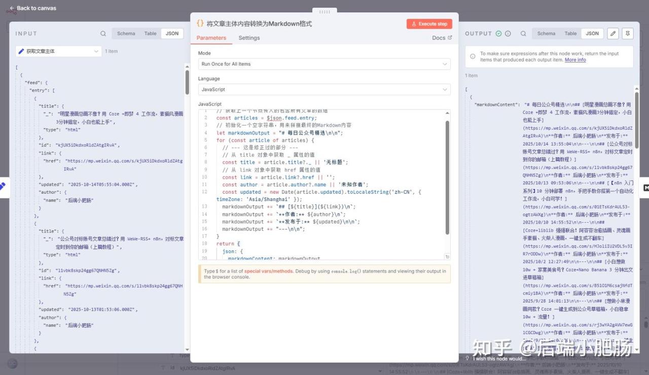 点击【+】按钮添加第5个节点Code,在代码部分输入将JSON格式转换为Markdown的功能代码,点击【Excute step】查看节点执行情况,可以看到数据格式由JSON转换为了Markdown格式。