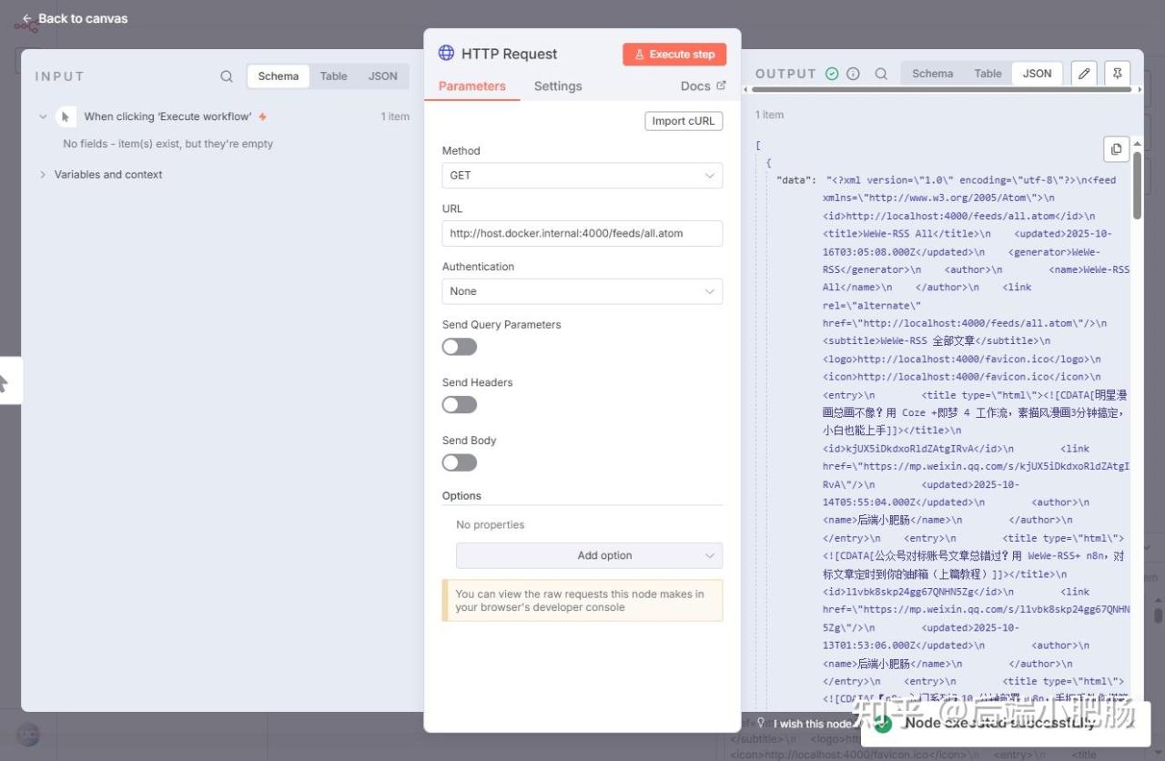 点击【+】按钮添加第2个节点Http Request,属性设置如下,在URL中填入http://host.docker.internal:4000/feeds/all.atom,其他属性保持默认,点击【Excute step】查看一下节点执行情况,可以看到结果为XML格式数据。