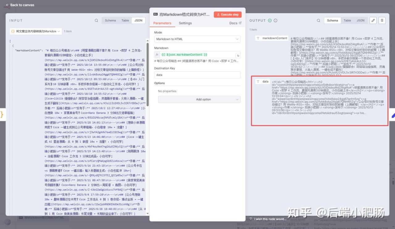 点击【Excute step】查看节点执行情况,可以看到经过这个节点的处理,数据由markdown格式转换为了html格式。
