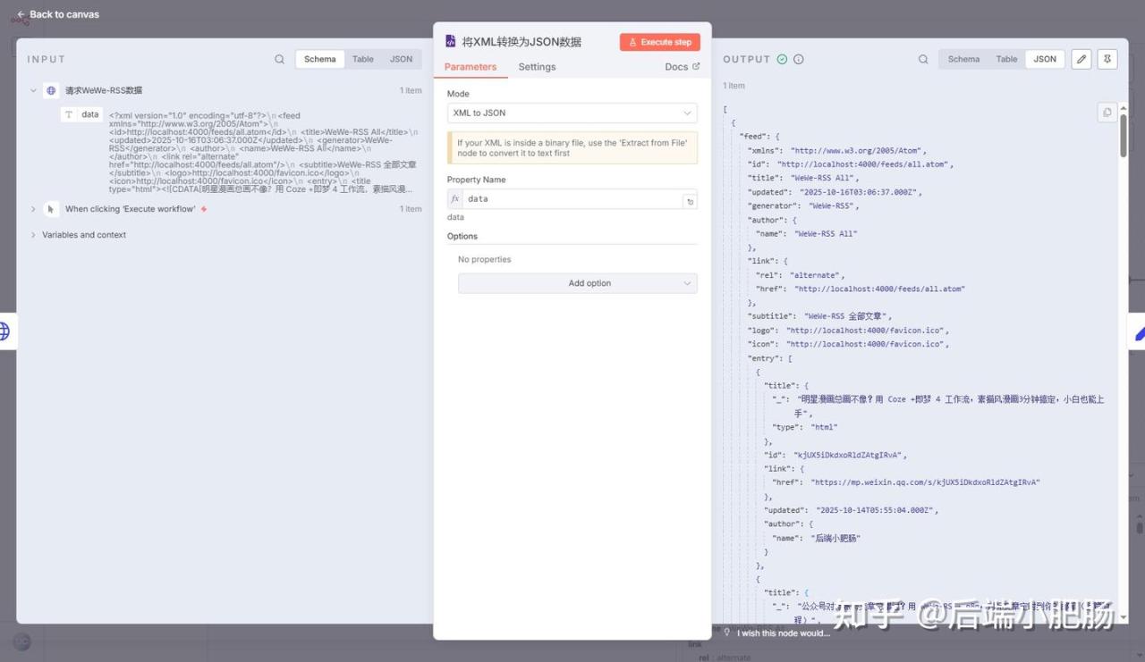 点击【+】按钮添加第3个节点XML,Mode选择XML toJSON,Property Name保持默认data。点击【Excute step】查看一下节点执行情况,可以看到这个节点将前一个节点输出的XML数据转换为了JSON格式。