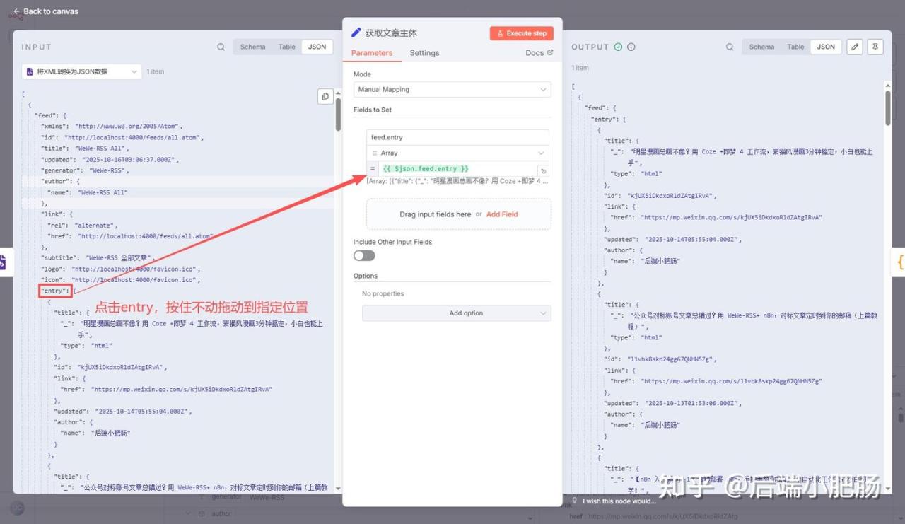 点击【+】按钮添加第4个节点Edit Fields,这个节点的作用主要是取出我们想要的数据部分,在这里我只需要entry部分的数据,故将enty拖动到Edit Fields属性面板。
