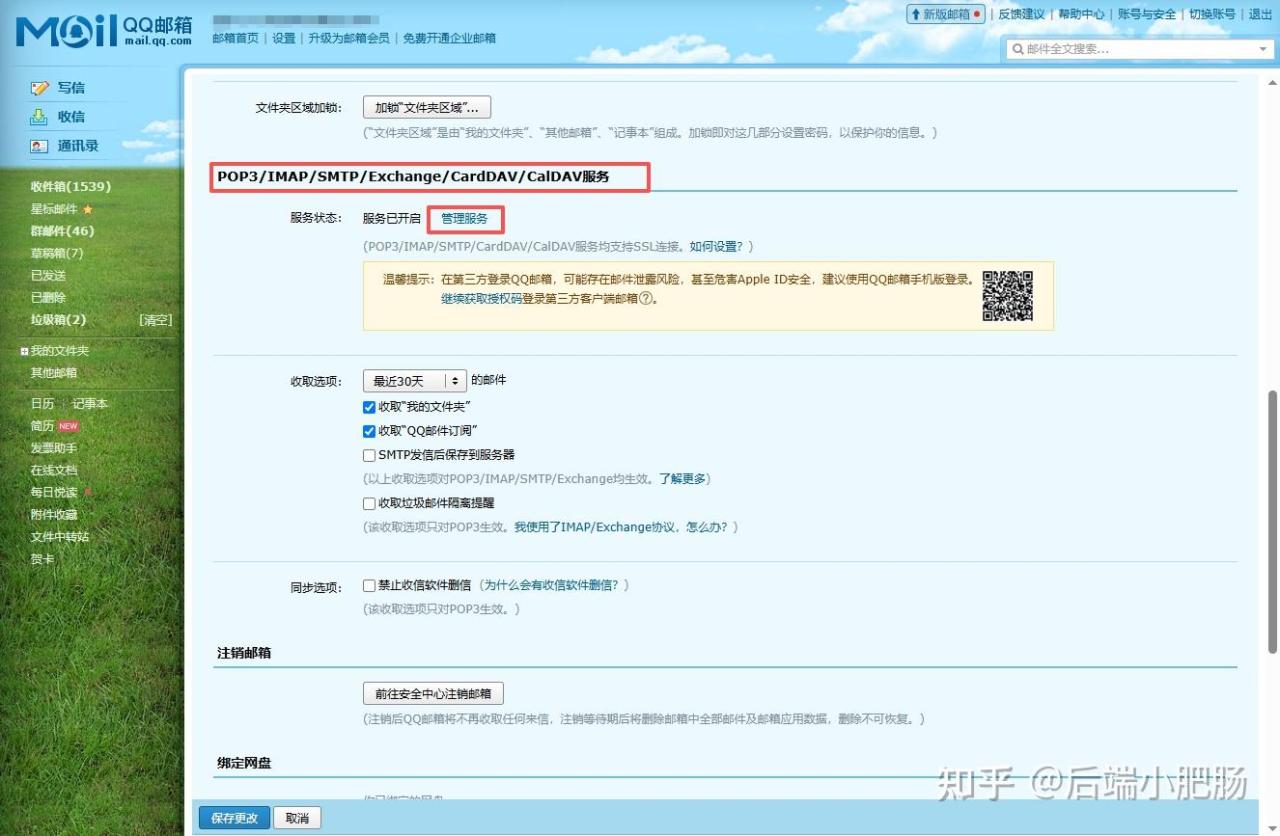 2. 进入页面后点击顶部的【设置】,点击【账号】切换标签页,开启POP3/IMAP/SMTP/Exchange /CardDAV/CalDAV服务,如果服务已经开启,点击【管理服务】