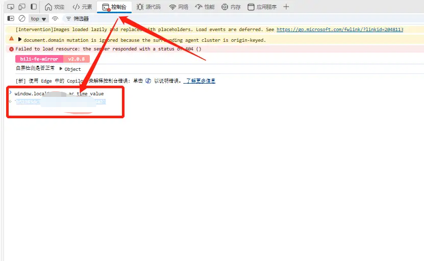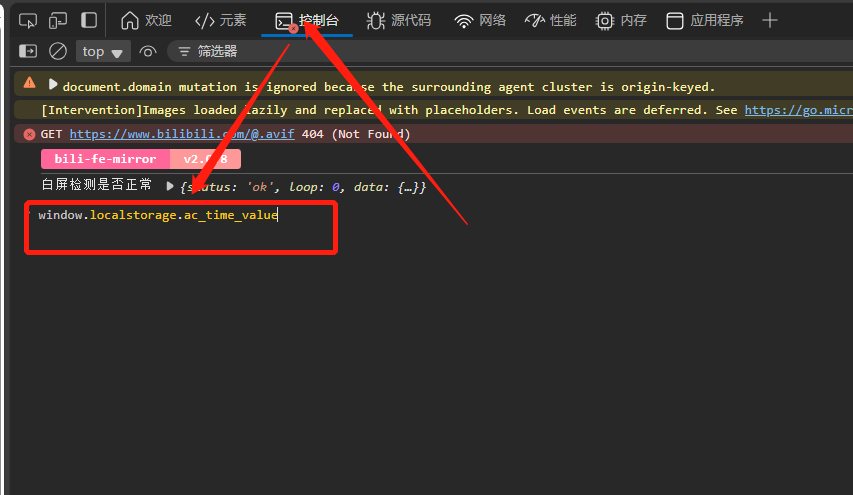 步骤3:首先点【控制台】,接着输入 window.localStorage.ac_time_value 获取ac_time_value的值,把该值复制保存留着后面步骤操作需要。