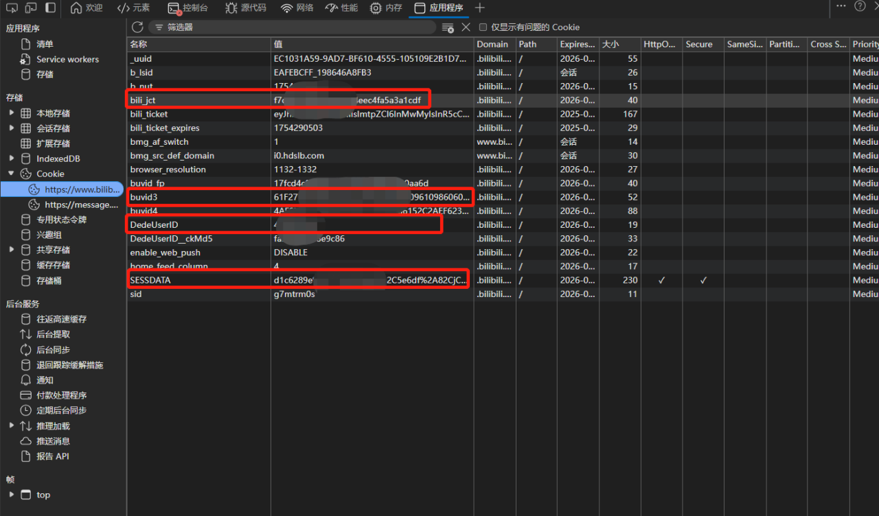 步骤4:依次点击【应用程序】→【Cookie】 选择https….. 右侧有SESSDATA,bili_jct,buvid3,dedeuserid四个参数的值,同样进行保存备用。