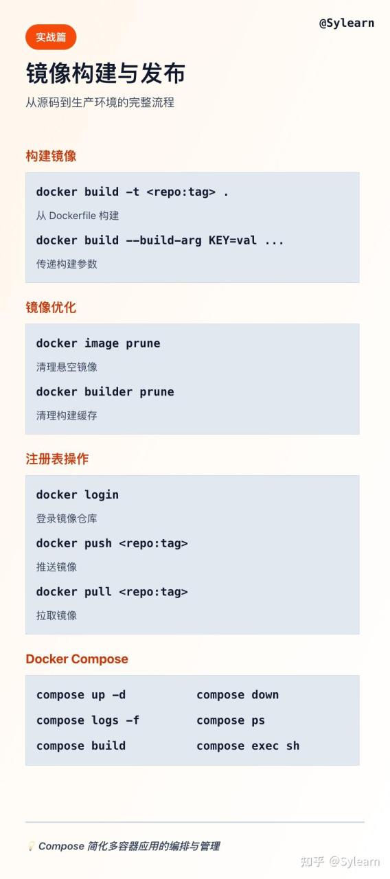 docker build -t repo:tag .是底层逻辑,--build-arg用于注入构建时变量(比如 Git SHA)。把版本号写进标签,方便回滚。 - 优化阶段:每次发布前执行一次