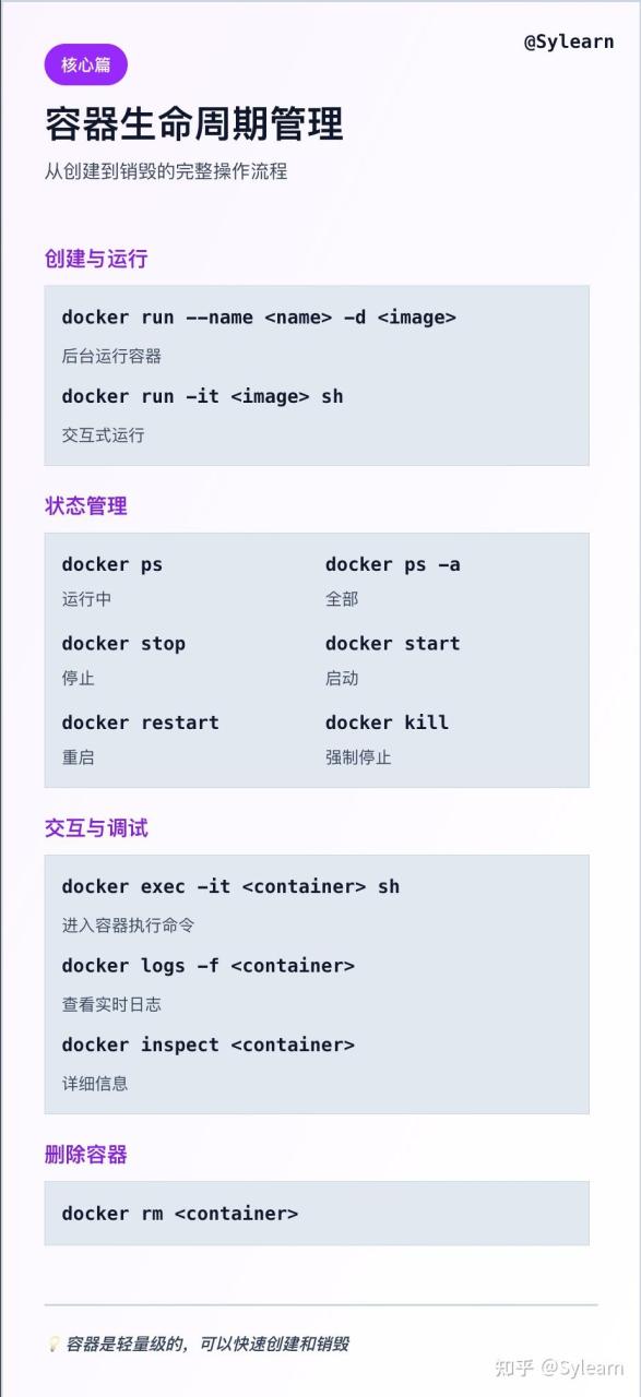 docker restart和docker kill分别对应“平滑重启”和“立即兜底”。日志排查时离不开docker logs -f与docker inspect。 - 容器删除 (