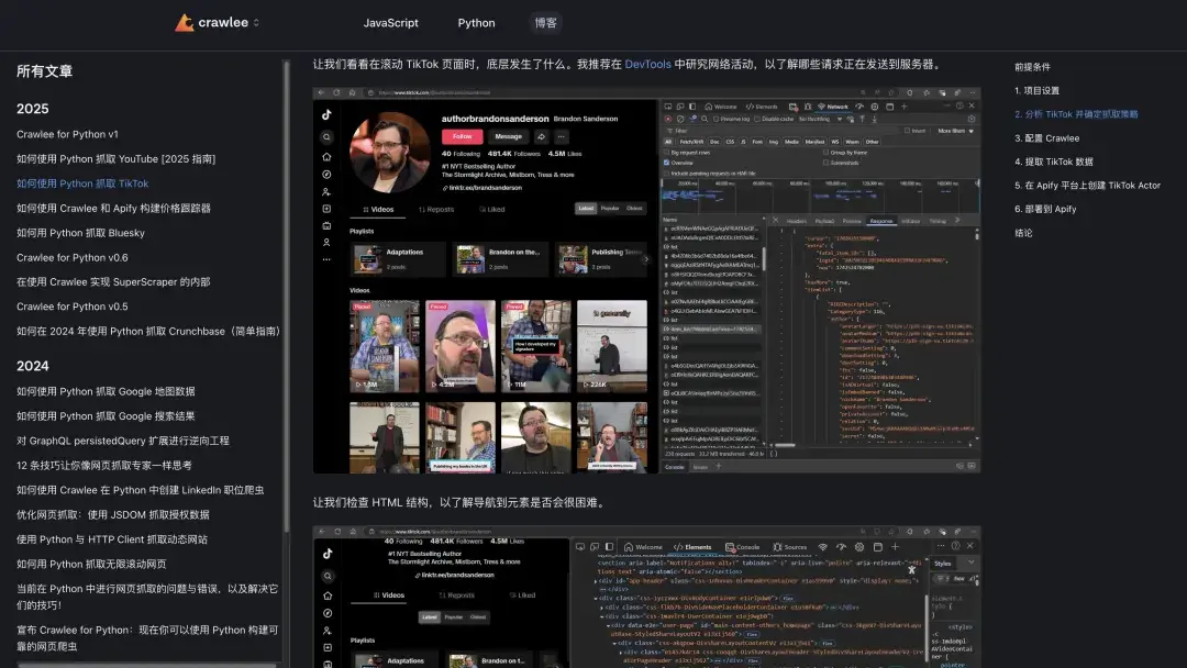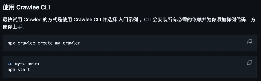 不会用也不怕,开源项目提供了一个详细的使用收藏,还有很多手把手教程实例,教你使用 Crawlee。