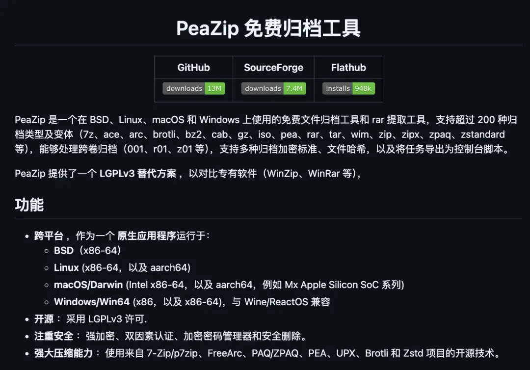 PeaZip 是一款免费开源的压缩与解压缩工具,支持多种操作系统,包括 Windows、Linux、macOS 和 BSD。