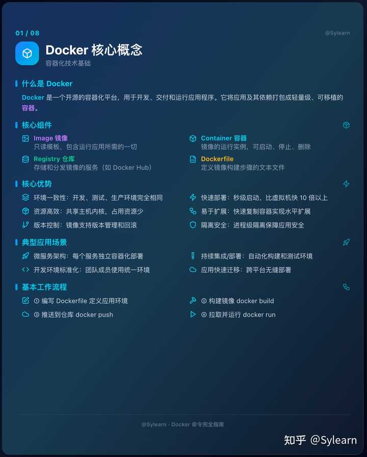 - 核心组件:镜像、容器、Registry、Dockerfile。镜像对应可重用的运行时模板,容器则是镜像的活体实例。