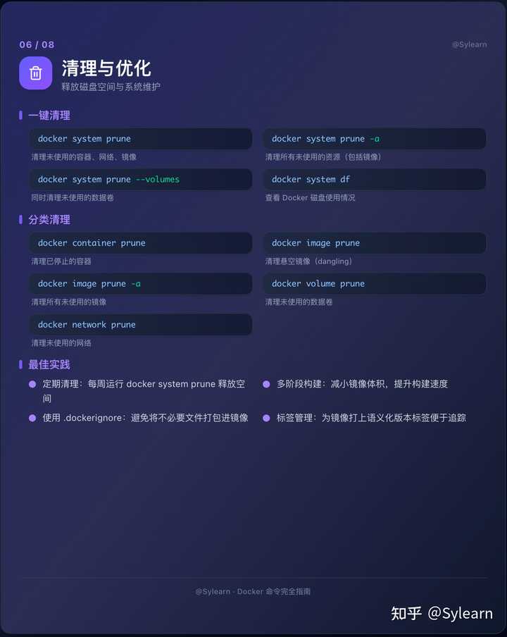 docker system df查看磁盘占用。 - 最佳实践:定期清理、使用