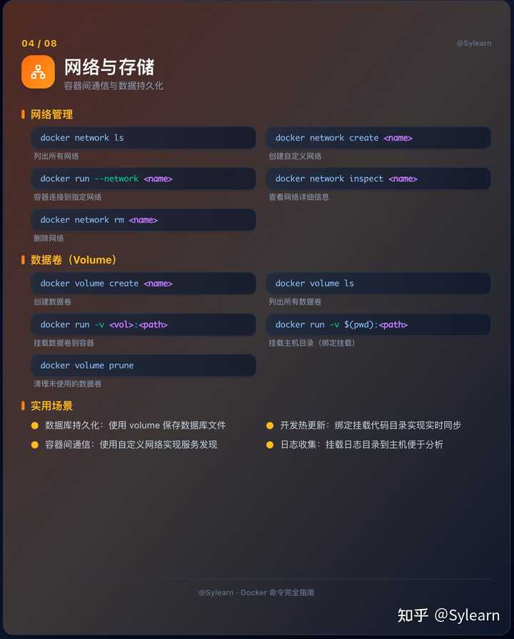 docker network create internal-net构建隔离网络,docker run --network internal-net让容器加入。 - 数据卷: