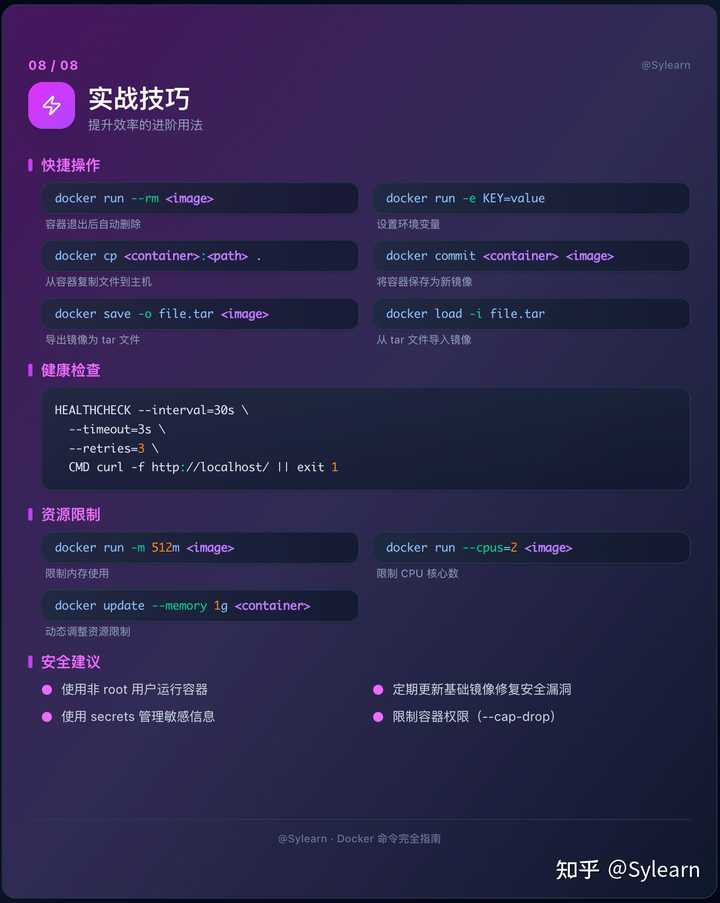 docker run -m 512m --cpus=2避免某个容器耗尽资源。 - 安全建议:限制使用 root、管理 secrets、定期更新基础镜像、通过