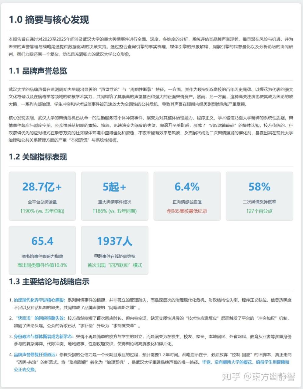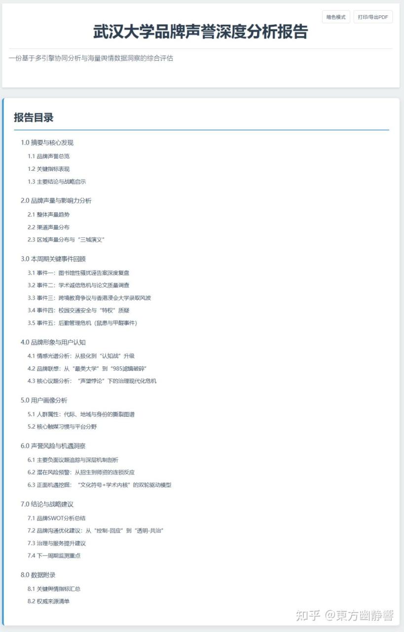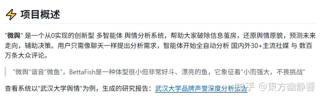 在 github 上的项目概述部分,作者提供了一个“武汉大学品牌声誉深度分析报告”案例:
