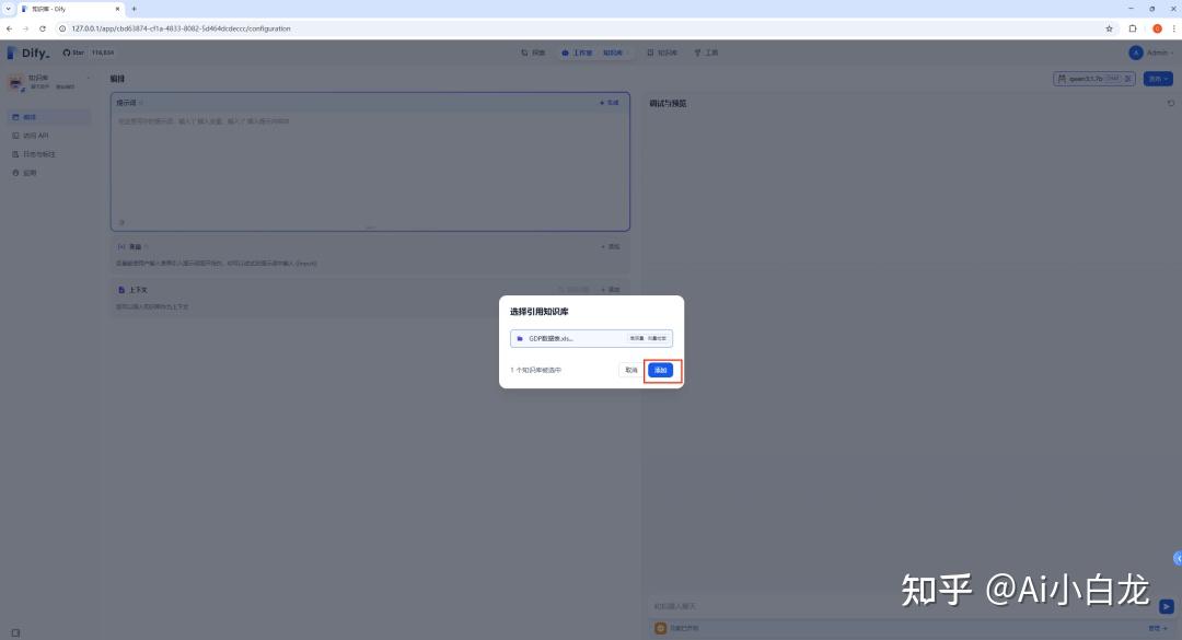 (5)选择刚刚创建的知识库,点击「添加」即可