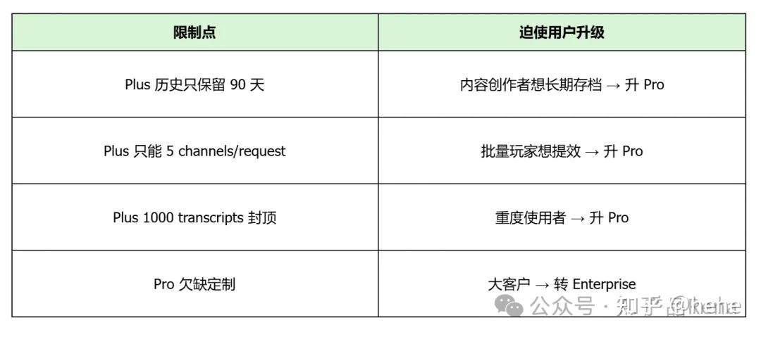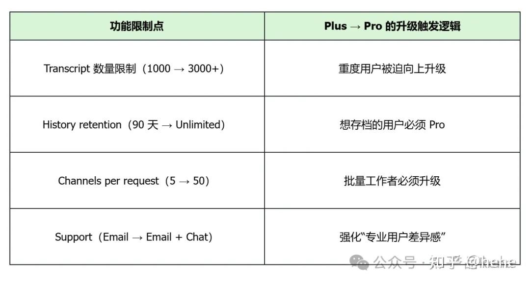用户转化路径:免费体验 → 感受到价值(转录+导出)→ 需要更大规模或历史保留 → 升级付费。