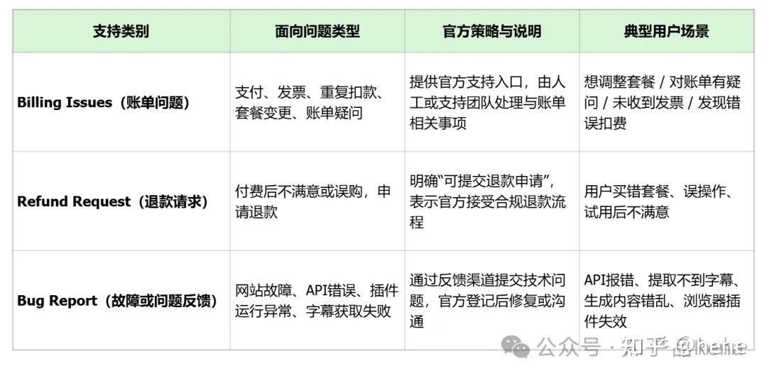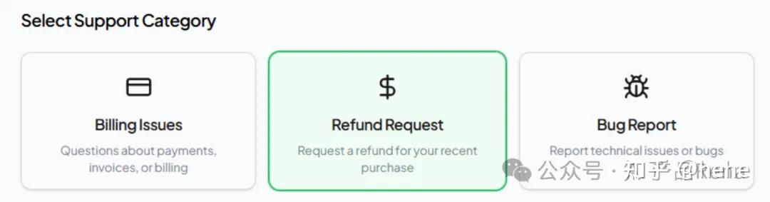 海外产品的服务策略果然简单且透明,就3个大方向:Billing Issues(账单问题)、Refund Request(退款请求)、Bug Report(故障或问题反馈)。