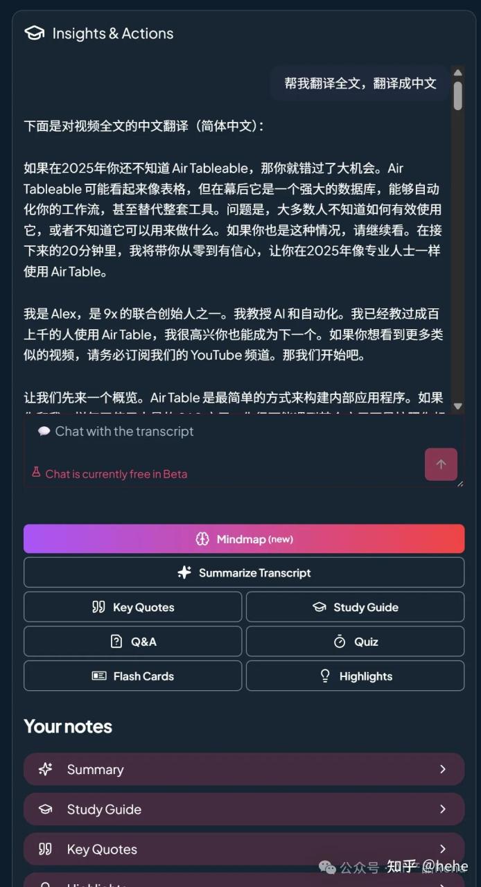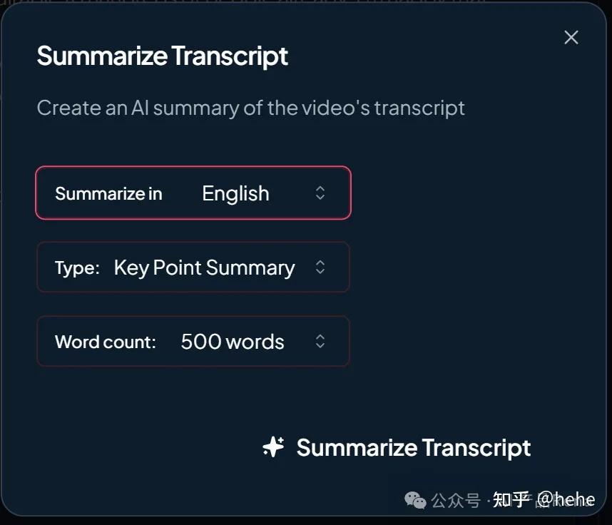 - 总结(Summarize Transcript):对视频转录文本进行 AI 总结,提炼核心内容。总结是一个选择的交互卡片,降低人工语言输入的复杂度,比较清晰,我其实觉得这种交互可控性更强。