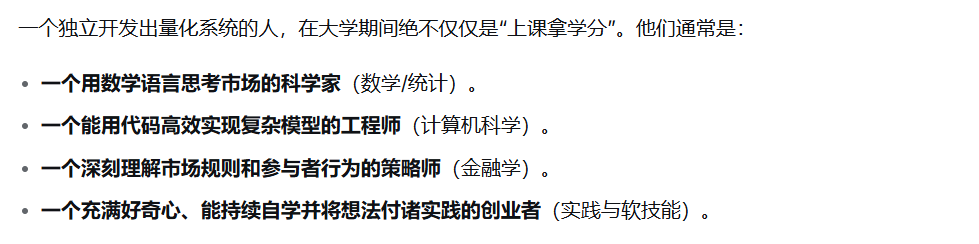 上面是工程实现层面的东西。其实真正核心的部分其实在于选股逻辑:这个就需要你学习基础的金融市场知识,理解交易机制与常用指标,你得思考怎么样找到影响股价的关键因子,网上那些烂大街的双均线之类的策略就算了。这部分还会涉及到一些统计学知识,比如你可以使用相关性分析等方法,初步判断你的哪个指标对股票涨跌的影响更显著。量化的优势就是对数据的利用效率,这个市场可以赚钱的模式太多了,吃透一种就够了,加油少年 。