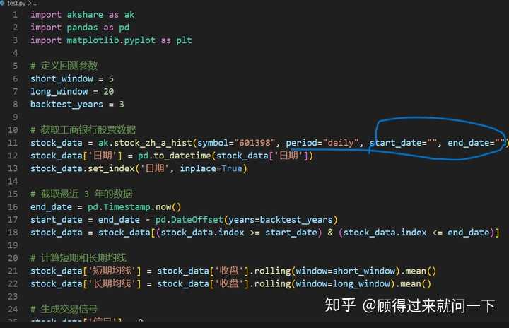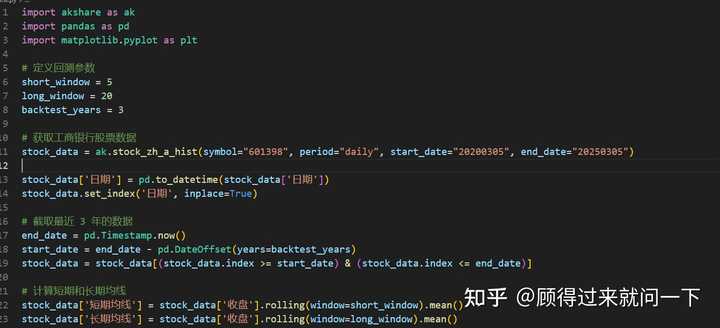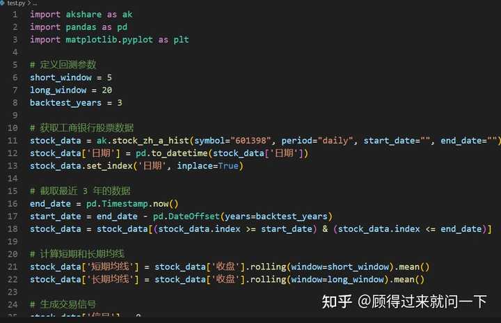 比如,你要用Python写一个双均线策略程序做交易的,短期设为5天,长期设为20天,假定用工商银行为例。双均线策略通常是:短期平均收盘价,向上突破长期平均收盘价,则买入;如果短期平均收盘价,向下突破长期平均收盘价,则卖出。