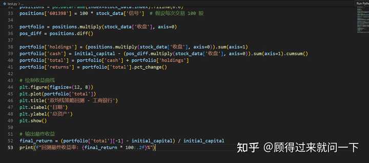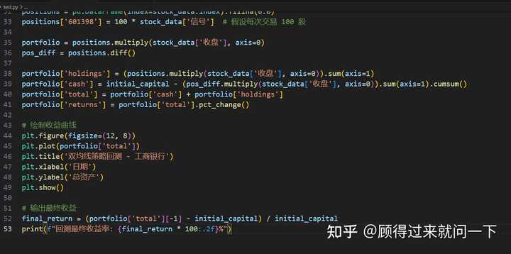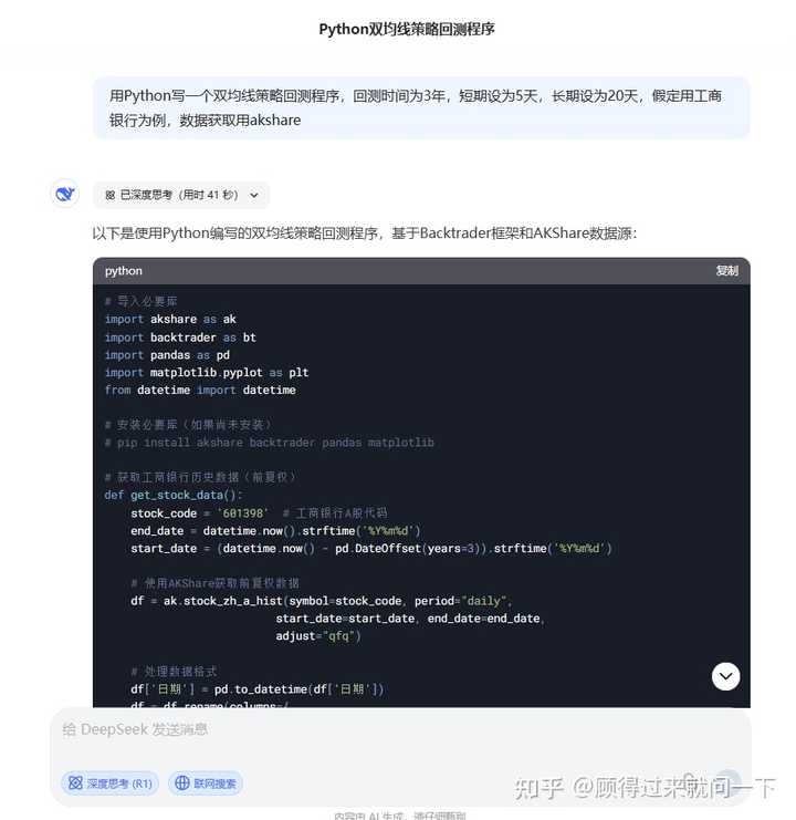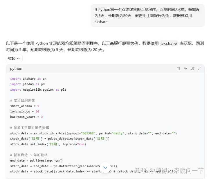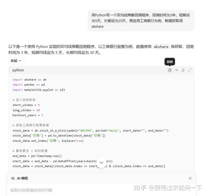 输入你的问题:用Python写一个双均线策略回测程序,回测时间为3年,短期设为5天,长期设为20天,假定用工商银行为例,数据获取用akshare。回车,它就会帮你写出代码来: