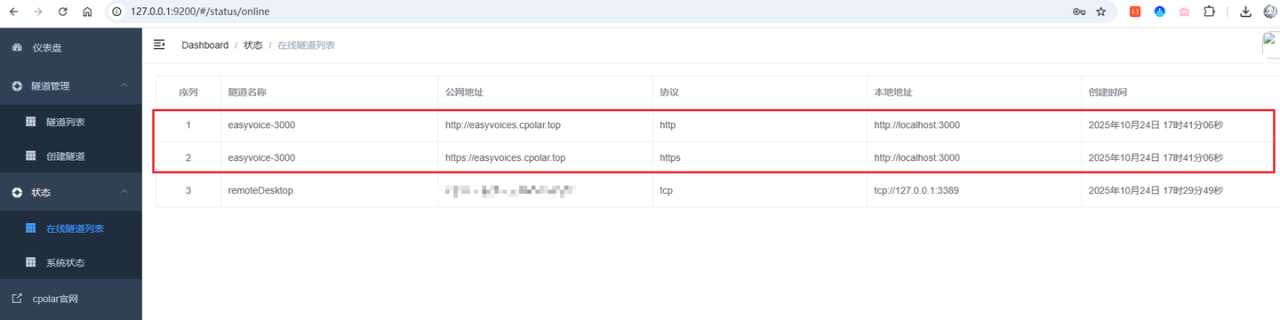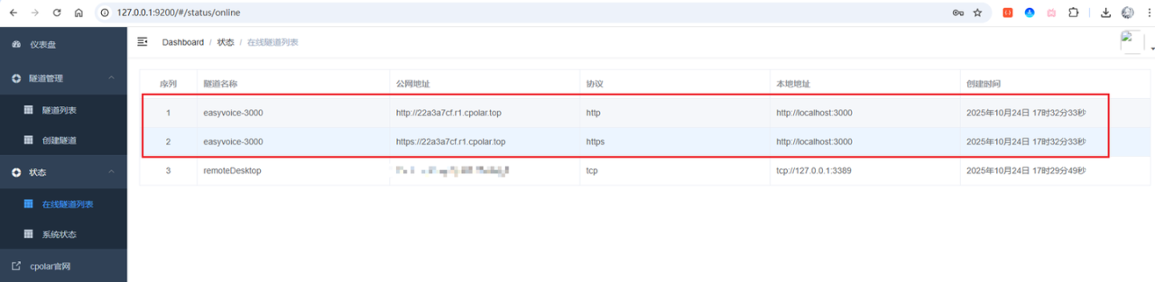 接着来到在线隧道列表,可以看到名称为easyvoice-3000隧道的两条记录信息,一条协议为http,另一条协议为https: