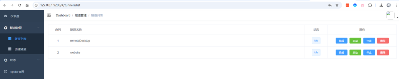 点击左侧菜单栏的隧道管理,展开进入隧道列表页面,页面下默认会有 2 个隧道: