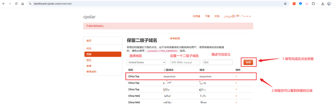 选择预留菜单,即可看到保留二级子域名项,填写其中的地区、名称、描述(可不填)项,然后点击保留按钮,操作步骤图如下: