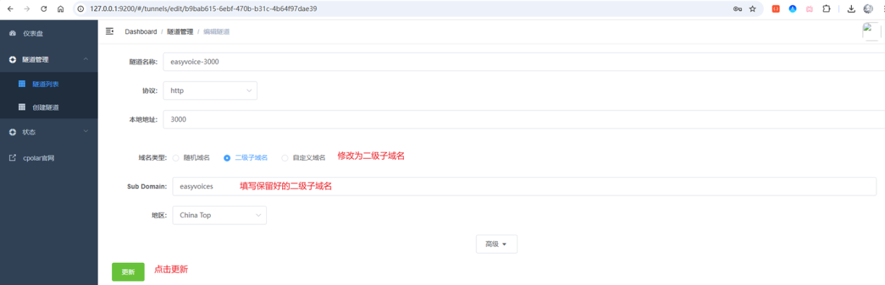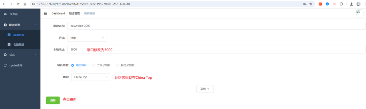 点击编辑名称为website的隧道,将端口改为easyvoice的3000端口,以及其他相关配置: