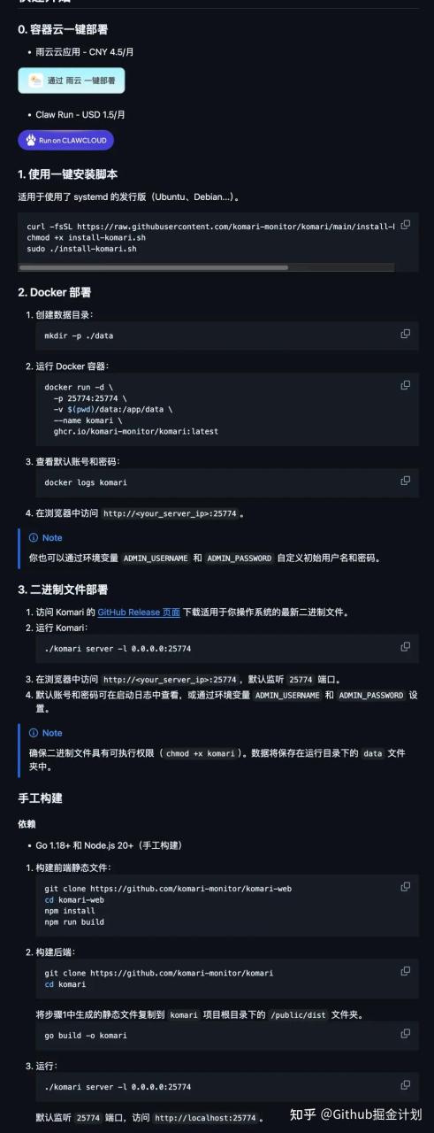 Komari 支持容器云一键部署(如雨云云应用,4.5 元 / 月;Claw Run,1.5 美元 / 月)、一键安装脚本(适用于 Ubuntu、Debian 等带 systemd 的发行版)、Docker 部署、二进制文件部署四种方式。