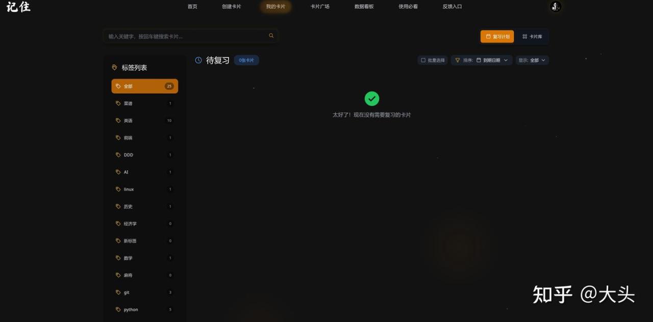 当然,你日常所需要做的只需要进入该页面,在复习计划页面下点击需要复习的卡片进行复习即可。不需要有任何学习压力和记忆负担,有就点进去复习,没有就不用管它,也不需要提前进行复习,系统也不支持,按照周期进行复习是最高效的。