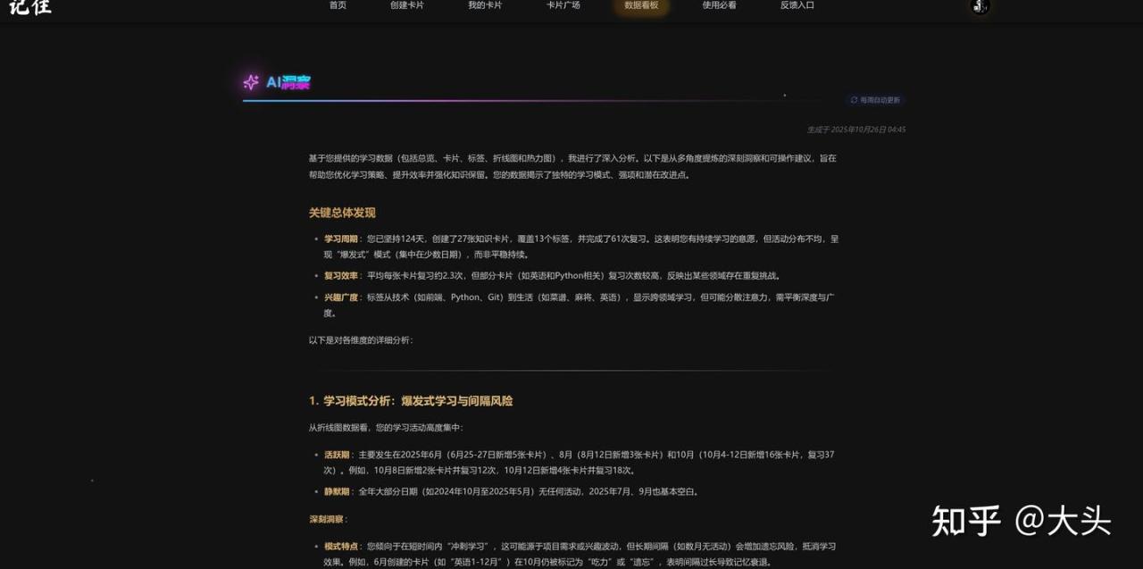 而且,除此之外,还有一个特色功能:每周系统会不定时的给每个用户生成一个综合的、深入的、详尽的学习报告,分析学习数据、学习习惯、存在的问题,并给出建议和方向。时不时看一下还是很有用的