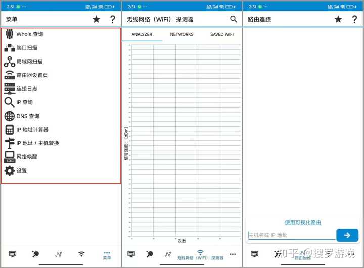 「WiFi Tools」功能包括 Whois 查询、端口扫描、局域网扫描、路由器设置项、IP查询、DNS查询、IP地址计算器……