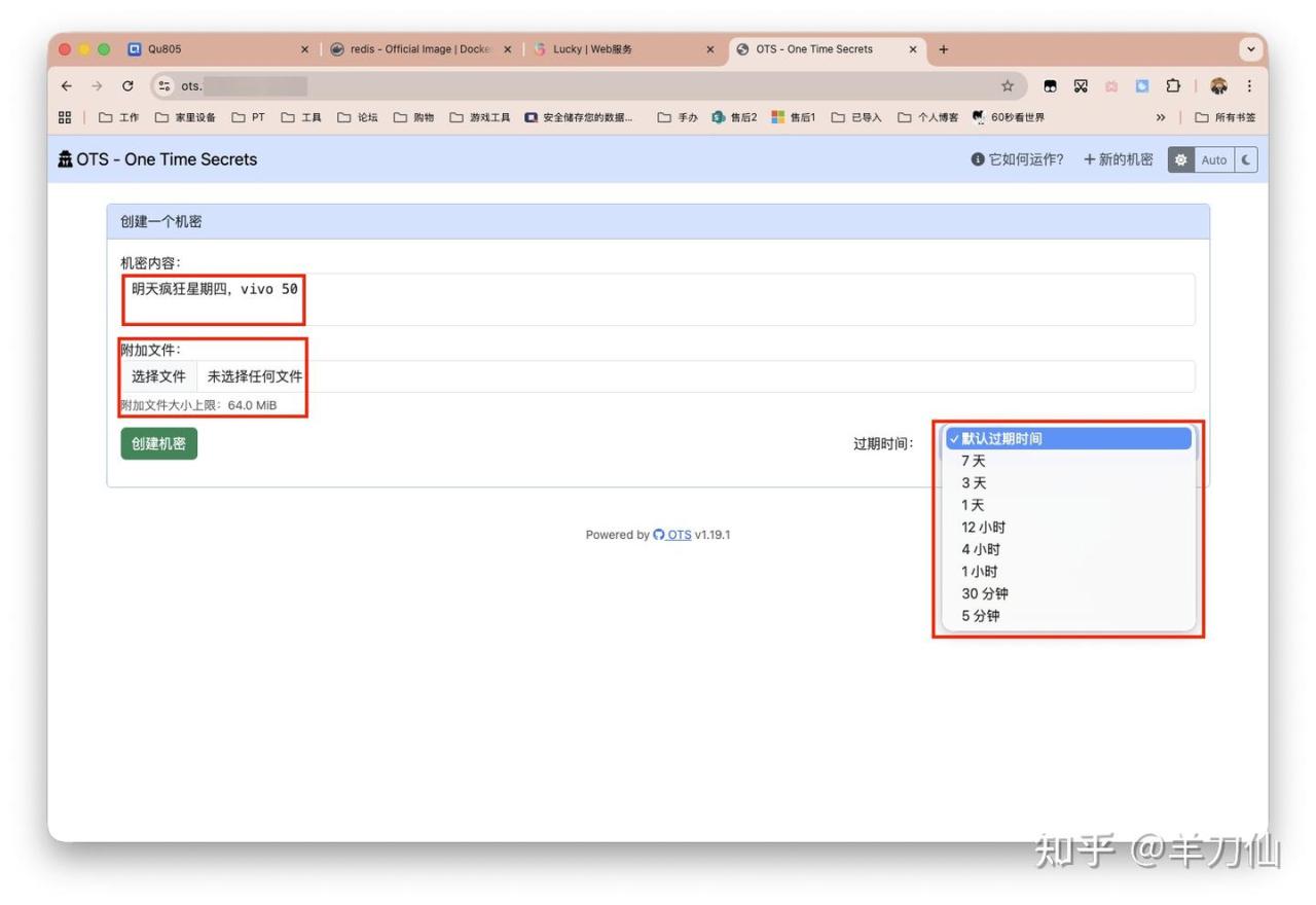 我这里已经做好了反代。界面如下。可以输入文本以及添加附件,设置过期时间。这个过期时间到了即便没被看过也会自动焚毁。