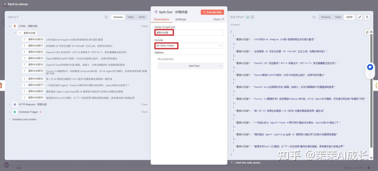 将输入数据中的一个字段(本例中是包含多个新闻条目的 最新AI日报 数组)拆分成单独的、多条输出数据,以便后续的节点能对每一条新闻进行独立处理。