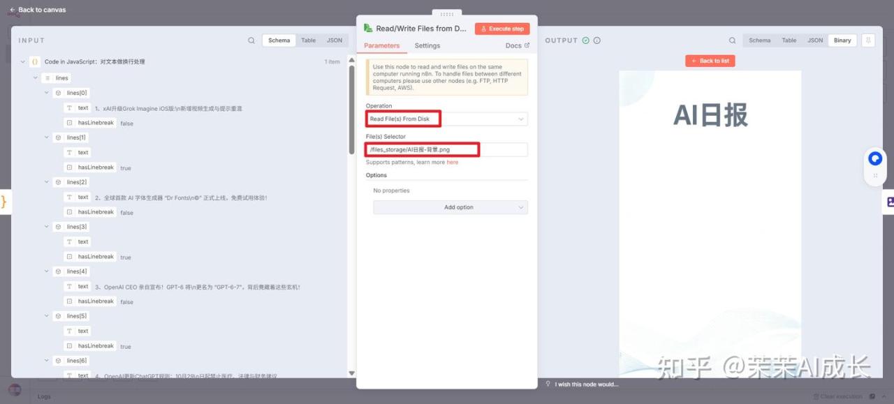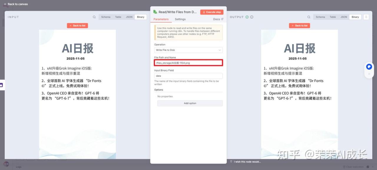 将上一步骤(Edit Image 节点)生成的、带有新闻内容的“AI日报”图片数据,写入到文件系统中的指定路径(/files_storage/AI日报-1104.png)进行保存。