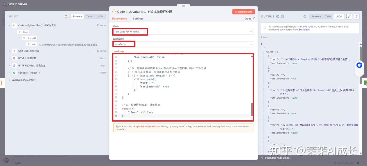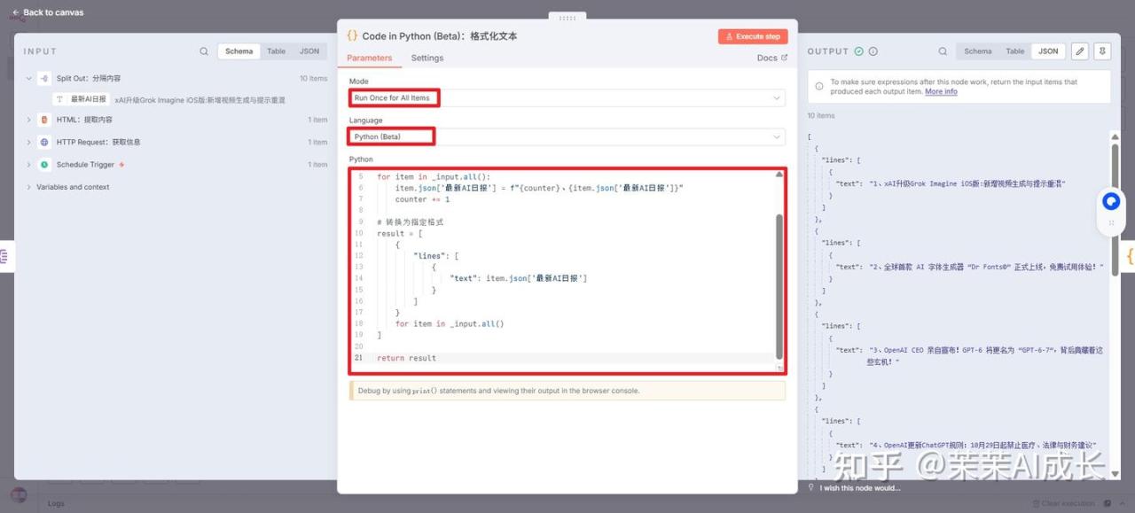 # 序号计数器 counter = 1 # Loop over input items and add 序号到 “最新AI日报” 内容的最前面 for item in _input.all(): item.json[‘最新AI日报’] = f”{counter}、{item.json[‘最新AI日报’]}” counter += 1 # 转换为指定格式 result = [ { “lines”: [ { “text”: item.json[‘最新AI日报’] } ] } for item in _input.all() ] return result
