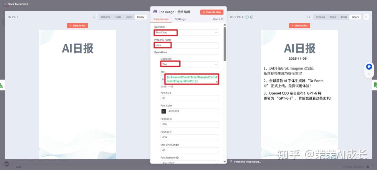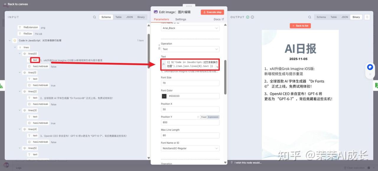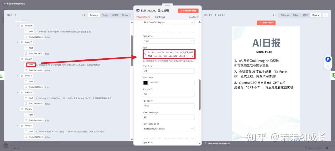 在从上一个节点获取的图片(“AI日报”背景图)上,以多步骤操作的方式,根据输入的文本内容和日期信息(2025-11-05)进行文本叠加,从而生成最终的新闻日报图片。