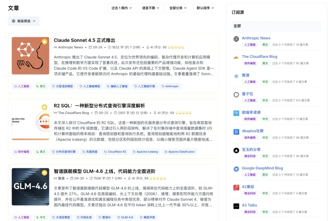 BestBlogs 就可以把 X、小宇宙播客、优质推文、博客、视频啥的推给你,在一个平台看最近的 AI 科技大事儿。它利用 AI 大语言模型对文章进行摘要、评分和翻译,帮助用户高效筛选高价值内容。