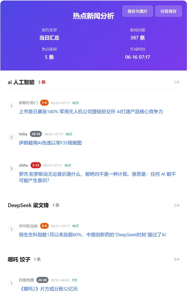 支持智能关键词筛选,比如设置个人关键词,比如:AI、开源,只推送相关热点,过滤无关信息,自动生成热点分析报告。