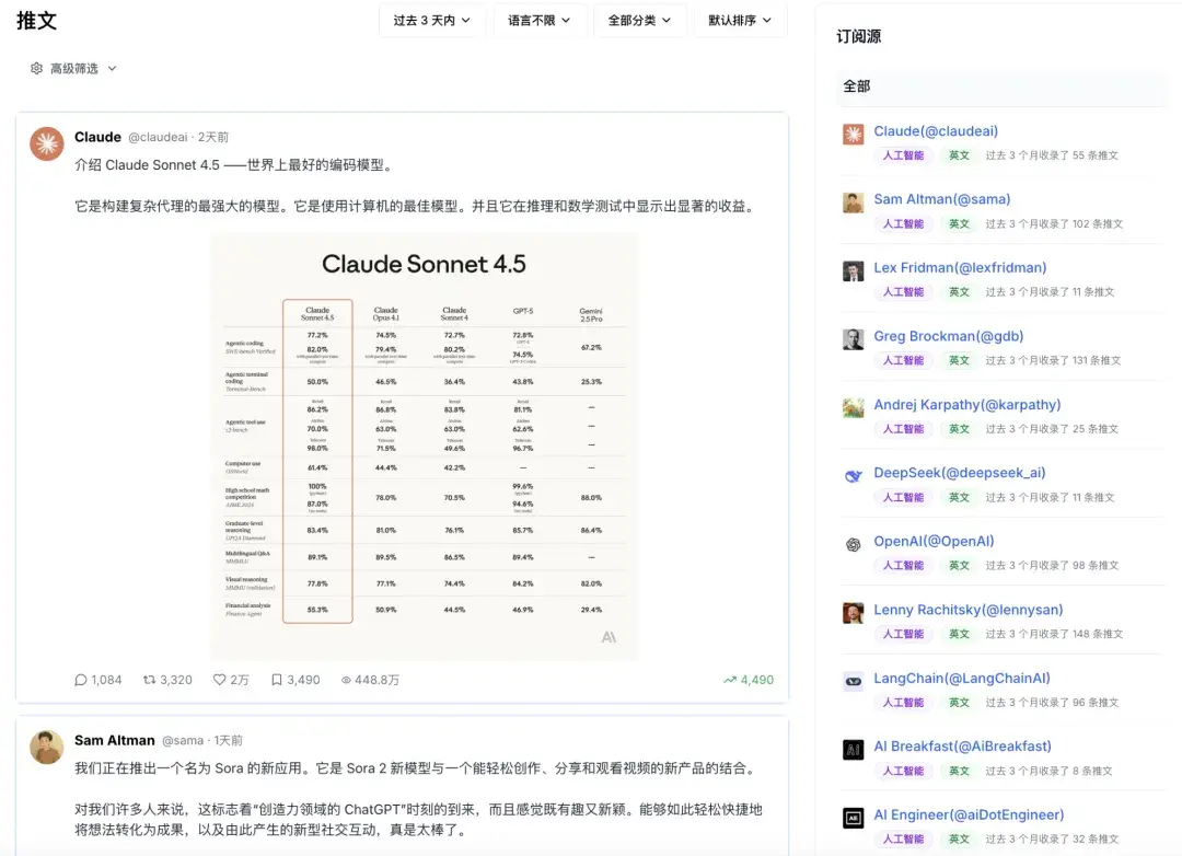 我经常看这个,最近什么模型发布了、什么新产品,大 V 们说了什么有意思的事情,这个开源项目都能聚合爬取。如果使用 Folo 工具,也应该看到这个 AI Daily 的订阅源。