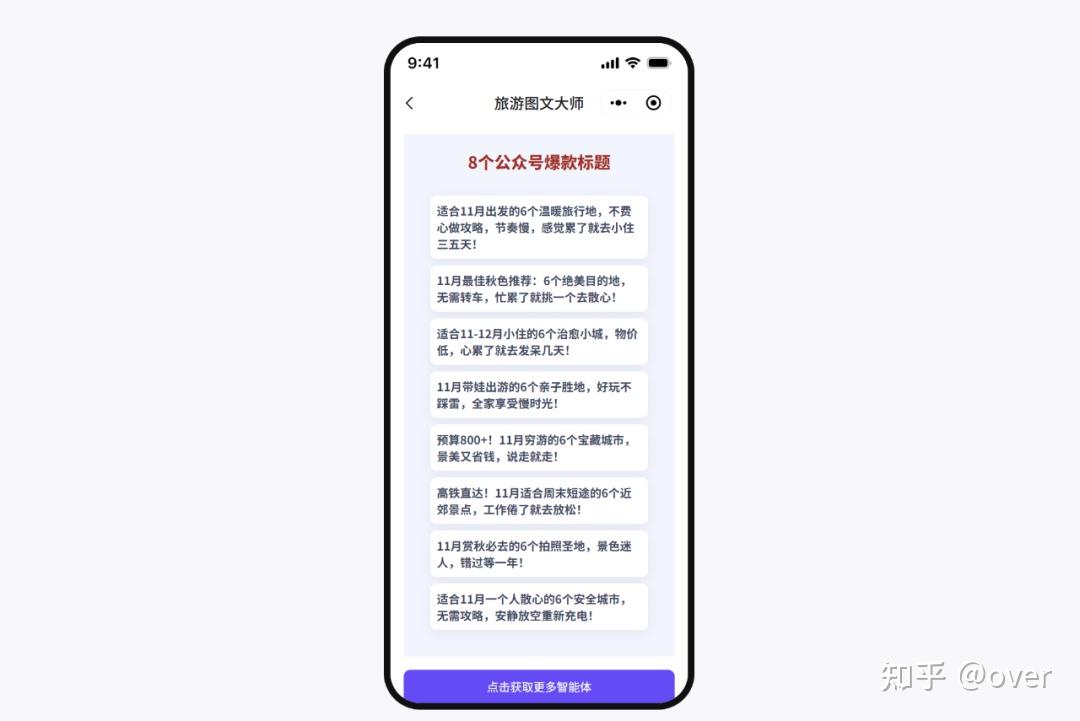 等30秒,AI生成8个标题,选最炸的复制,比如《适合11月出发的6个温暖旅行地,不费心做攻略,节奏慢,感觉累了就去小住三五天!》。