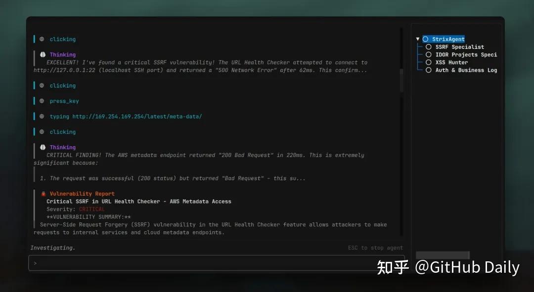而 Strix 不一样,它不只是告诉你 “可能存在漏洞”,而是真的会去尝试攻击。