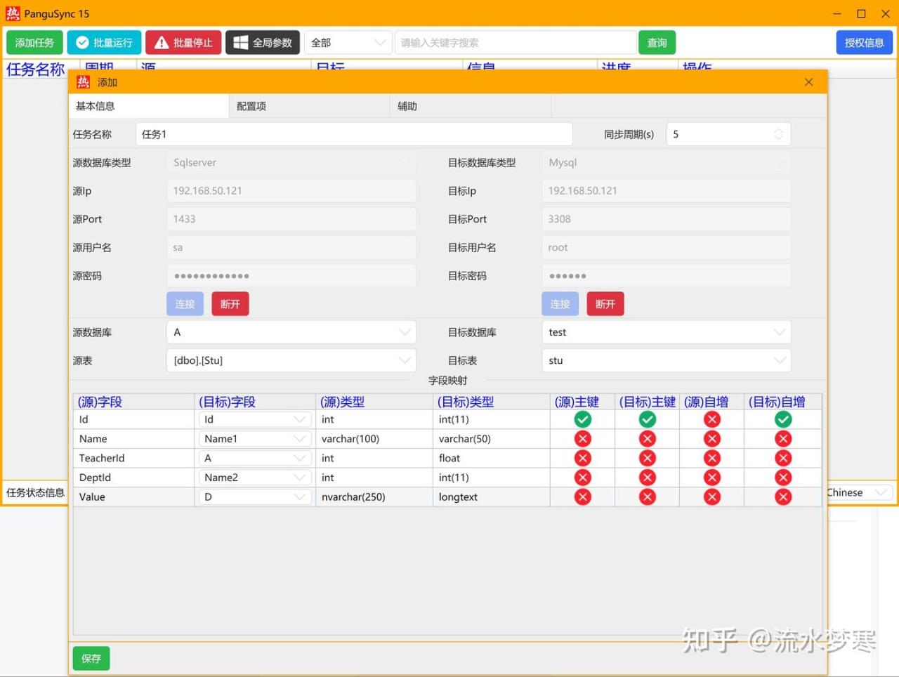 我们继续深入研究,该数据库同步软件不仅支持同构数据库的全增量同步,还支持异构数据库的全增量同步,也就意味着不仅Sqlserver与Sqlserver、Mysql与Mysql、PostgreSQL与PostgreSQL之间能互相同步,而且还能进行Sqlserver、Mysql、PostgreSQL之间互相同步,甚至还能自定义字段映射,比如源Mysql的字段A同步到PostgreSQL的B字段,这使得该款数据库同步软件的灵活性大大的增强。看看下面这图,又是异常的舒适!