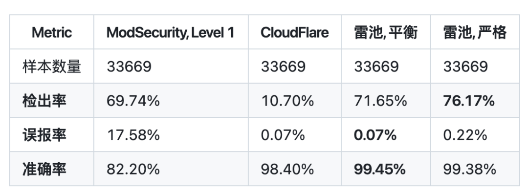 在 SafeLine 官方文档看到一组防护效果测试数据:在同样的样本数量下,传统 WAF(ModSecurity) 的误报率高达 17.58%,而SafeLine 只有 0.07%,同时检出率还更高。